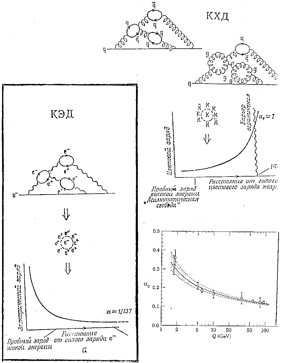 Электрон окружен облаком зарядов, которое поляризовано так, что положительные заряды расположены ближе к электрону, а отрицательные дальше, что создает экранировку электрического заряда электрона. Измеренный заряд зависит от расстояния, на котором проводится измерение. В случае цветового заряда ситуация более сложная. Наряду с аналогичным процессом экранировки цветового заряда, необходимо учесть процессы, обусловленные глюонами. Глюоны также являются источниками цветового поля. Поэтому результат оказывается прямо противоположным - красный кварк оказывается окруженным преимущественно другими красными зарядами. При приближении к красному заряду пробной частицы она проникает внутрть облака красного заряда и, следовательно, измеренная величина красного заряда уменьшается, то есть при уменьшении расстояния между кварками их сила взаимодействия уменьшается и они ведут себя как свободные, невзаимодействующие частицы.