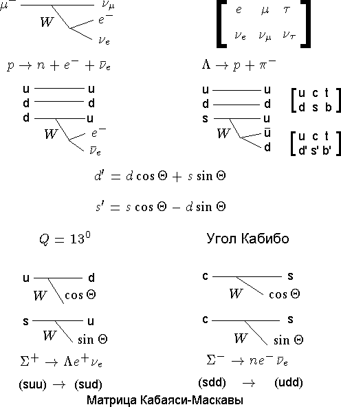 - кварки участвуют в слабых взаимодействиях, излучая или поглощая глюон; при этом меняется цвет кварка, а его тип (аромат) остается неизменным: